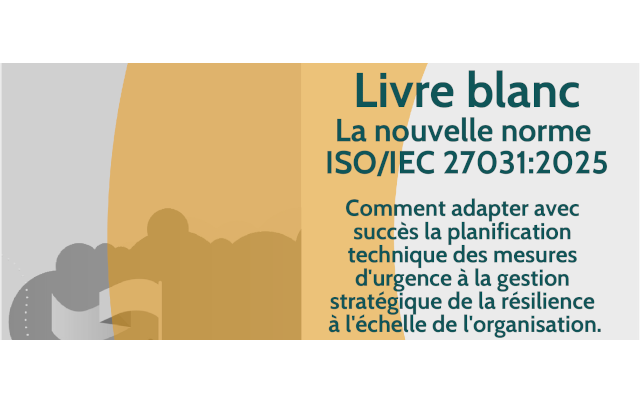 Depuis mai 2025, la norme ISO/IEC 27031 révisée met l'accent sur la résilience organisationnelle. La préparation des TIC à la continuité des activités (IRBC) est désormais ancrée stratégiquement et étroitement liée à la continuité des activités, à la sécurité de l'information, à la réponse aux incidents et à la gestion des risques. La résistance aux crises devient ainsi un élément essentiel de la force entrepreneuriale et de la sécurité pour l'avenir.Avec la version révisée de l’ISO/IEC 27031:2025, une nouvelle ère de résilience organisationnelle s’ouvre. Ce livre blanc met en lumière les évolutions les plus marquantes par rapport à l’édition de 2011, les replace dans un cadre stratégique et montre comment les organisations peuvent transformer ces changements en valeur concrète.